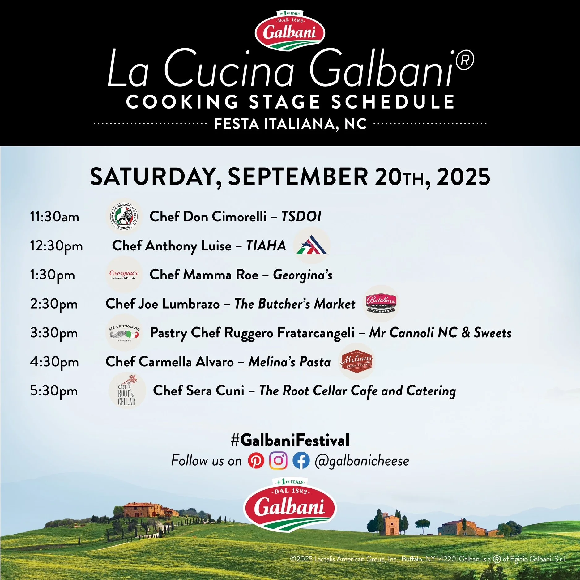 Welcome to the Galbani Culinary Stage, a favorite destination at Festa Italiana North Carolina! Whether you are a seasoned chef or a curious food enthusiast, our cooking demos will guide you through the art of creating delicious Italian dishes that capture the essence of La Dolce Vita! Chefs will share their expert tips and reveal secrets behind Italy’s most beloved flavors. Recipes will include Penne Pasta with Sausage and Sun-Dried Peppers in a Tomato and Ricotta Sauce; Chicken Penne Pasta; “The Big Gina”; Mozzarella-Stuffed Italian Sausage; Ricotta Gnocchi in a Sage Butter Lemon Sauce; and Fresh Ricotta Cavatelli Pasta, and there will also be a Sicilian Cannoli-Eating Contest!, So come hungry and get ready to learn Italy’s vibrant recipes so you can bring our cuisine into your own kitchen!